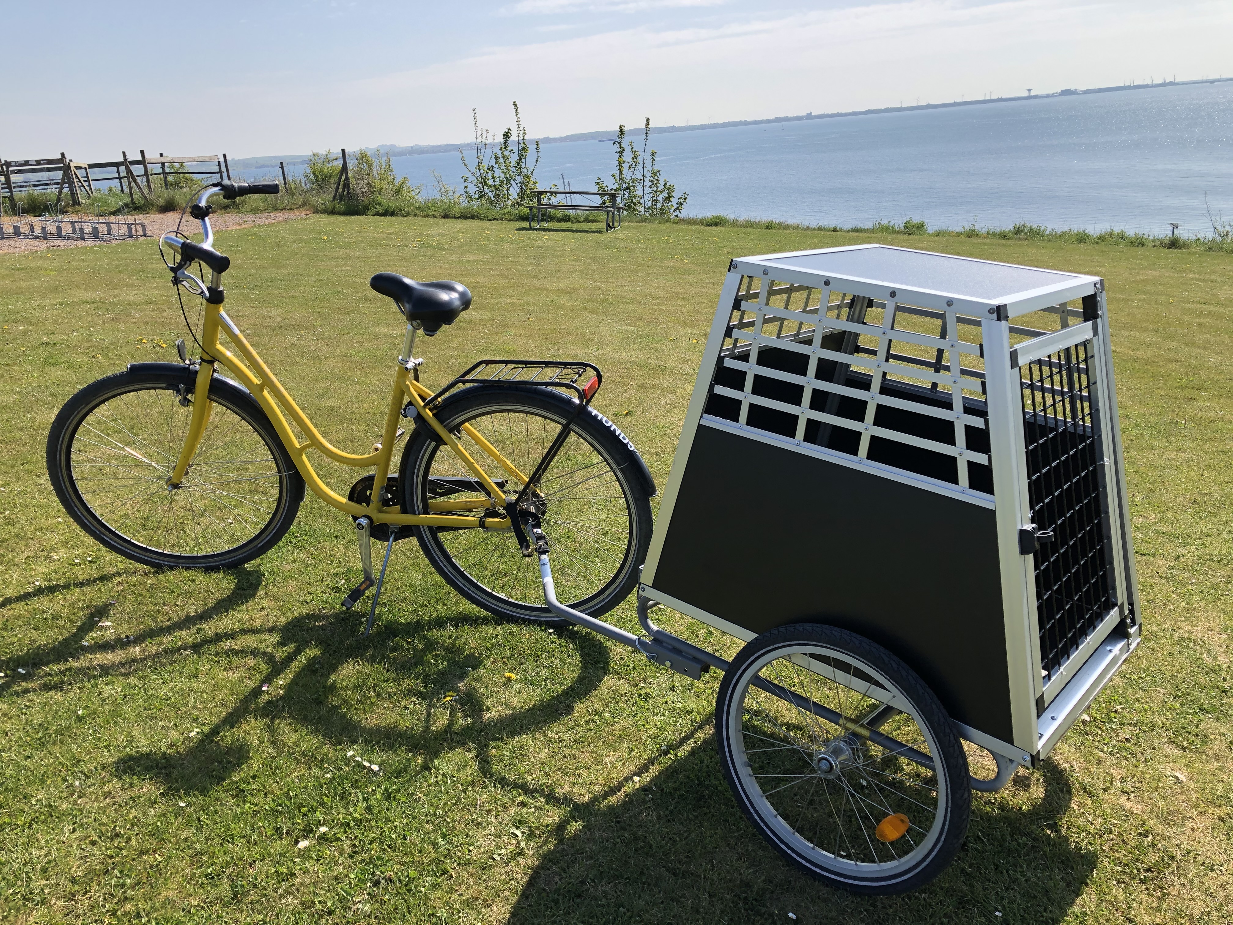 Vuxencykel med korg avsedd för mindre hund fastmonterad på pakethållaren.