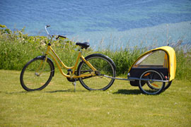 Vuxencykel med övertäckt kärra, plats för upp till två barn att sitta bredvid varandra.
